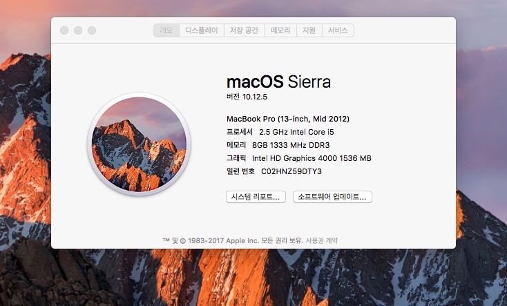 2012년 맥북프로 (맥 os 시에라 10.12 설치함)2012년 맥북프로13인치입니다