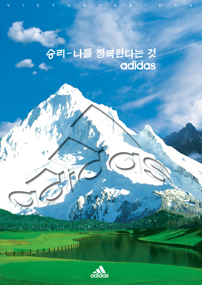 산에 아디다스 마크를 넣지 않아도 ... 위에 카피와 밑에 심벌이 있으니.. 배경을 원본그대로 보여주는것도 좋을듯 하네요 ... 웅장한 산 (정복하고 싶은 대상을..)표현 하고 심플하게 로고하나만 딱! 요즘 현대 TV광고도 비슷한 예 같으네요 ^^:; (울창한 숲만 나오다가 마지막에 현대로고.. 끝 물론 목적이 다르지만.. 전달하고싶은 이미지를 보여주고 마지막에 누구나알고있는 심벌마크로 연결 시켜서 광고하는..)